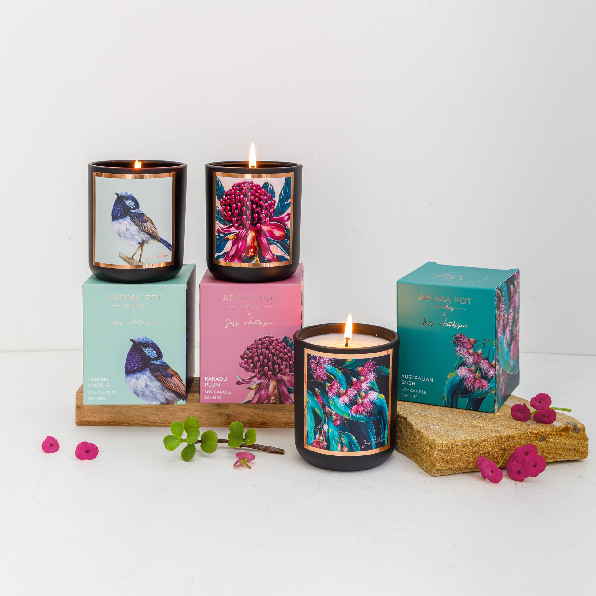 Experience the rich aromas of Kakadu plum with this luxurious artist candle. Hand-poured from a carefully crafted soy coconut wax blend, this will last over 50 hours, featuring stunning artwork of the Australian Waratah by artist Jess Hutchison.
