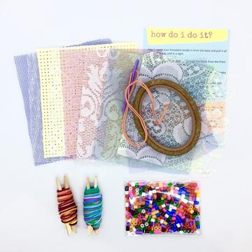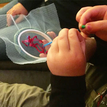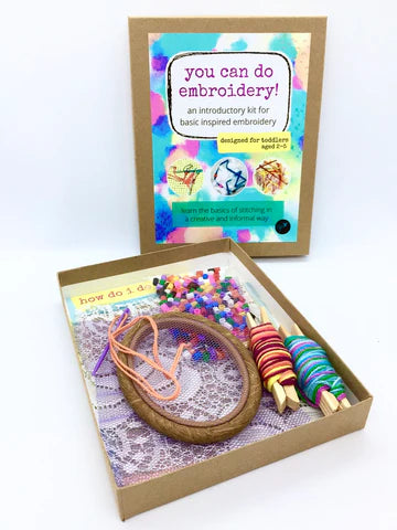 his introductory embroidery kit is designed to teach 2-5-year-olds the basic concepts of stitching with thread. It comes with a variety of pieces of lace, netting, and mesh fabrics which enable the child to focus on the action of stitching the thread in and out from front to back and back to front, without the worry of trying to also pierce the fabric, and not being able to see exactly where their needle is going.