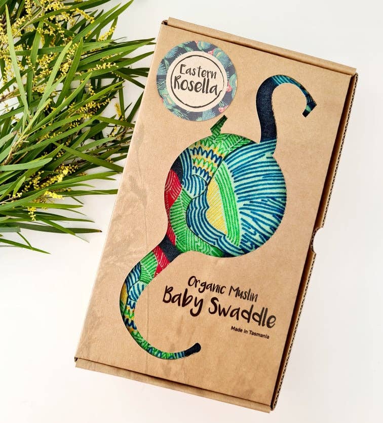 These silky soft natural baby swaddles are so snugly in our exclusive designs it is a happy collection of native blooms and birds, flora, and fauna juxtaposed together so you can wrap your wee small one in all the bright happiness that they deserve. Size: approx. 100 x 100cm Come beautifully boxed in an Eco-friendly craft cardboard box all ready to give as a gift! These ZERO waste 100% organic super soft double muslin swaddles are designed, captured, and made in Tasmania, Australia. The earthy nature-inspired fabrics are unique to SQ and printed using Eco water-based inks they are dreamy and wonderful and make the perfect gift for a wee little one.