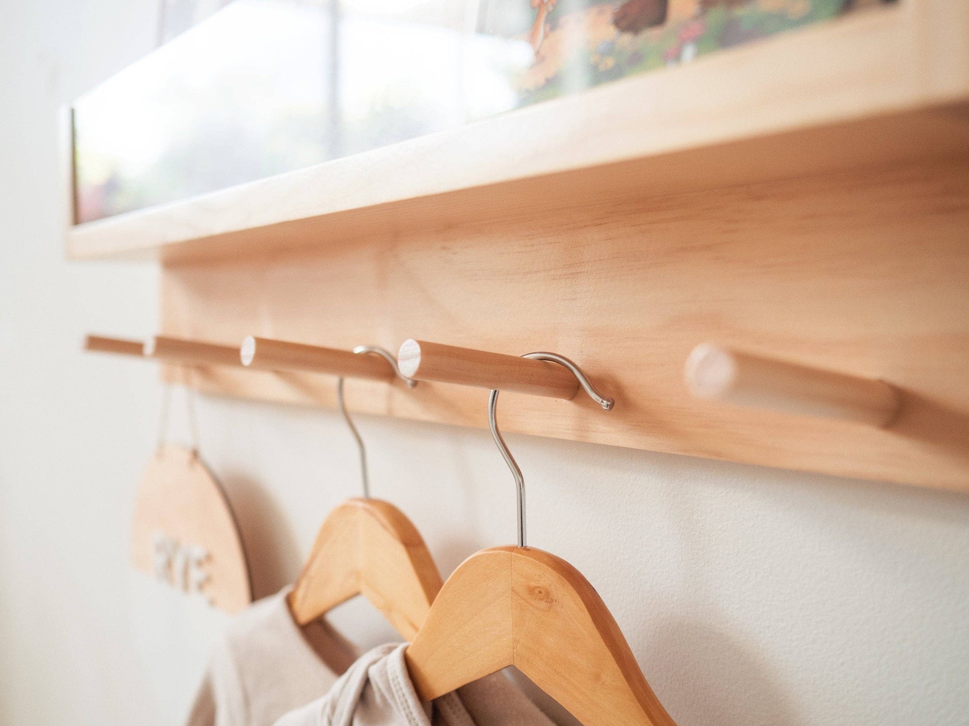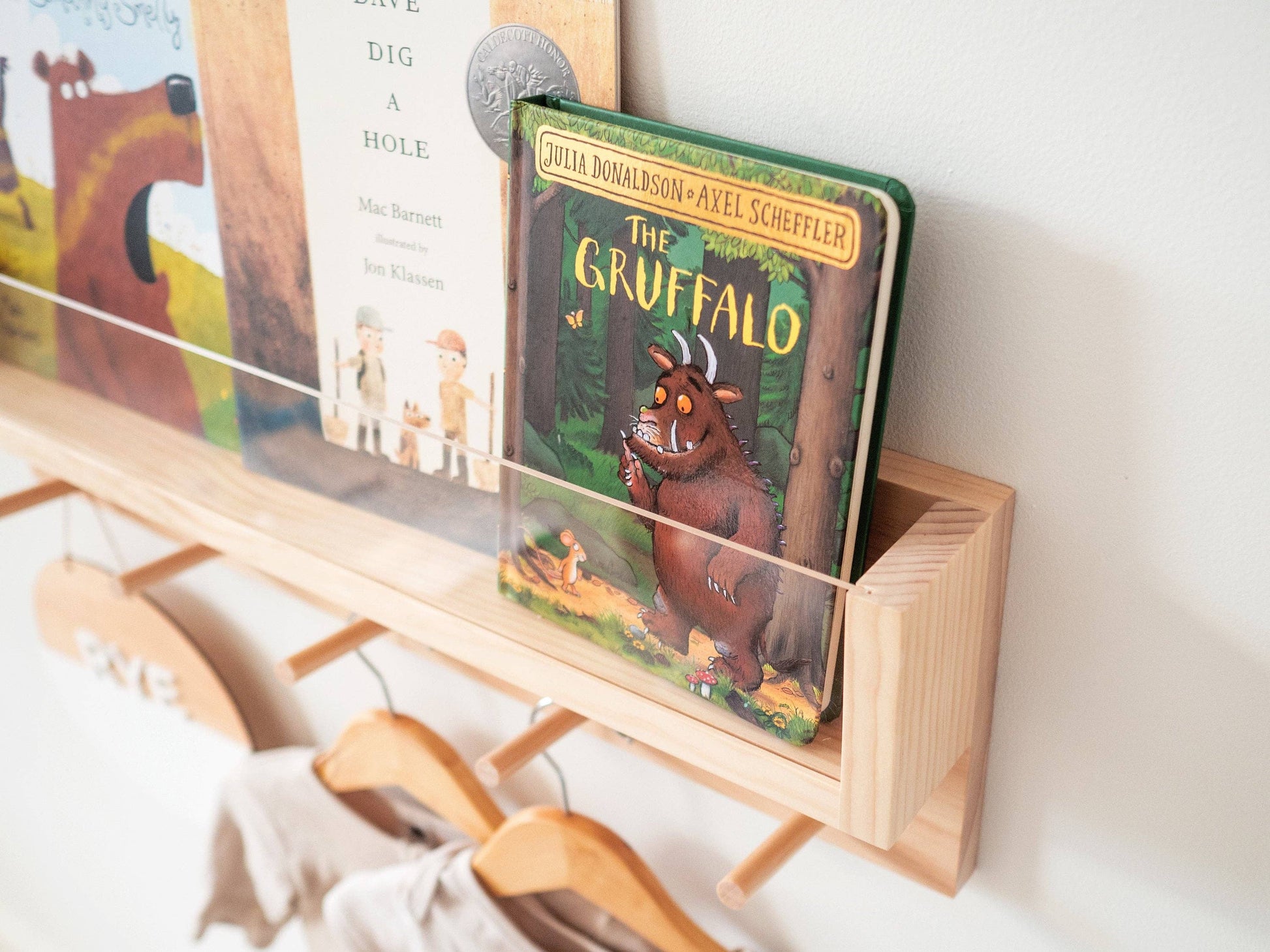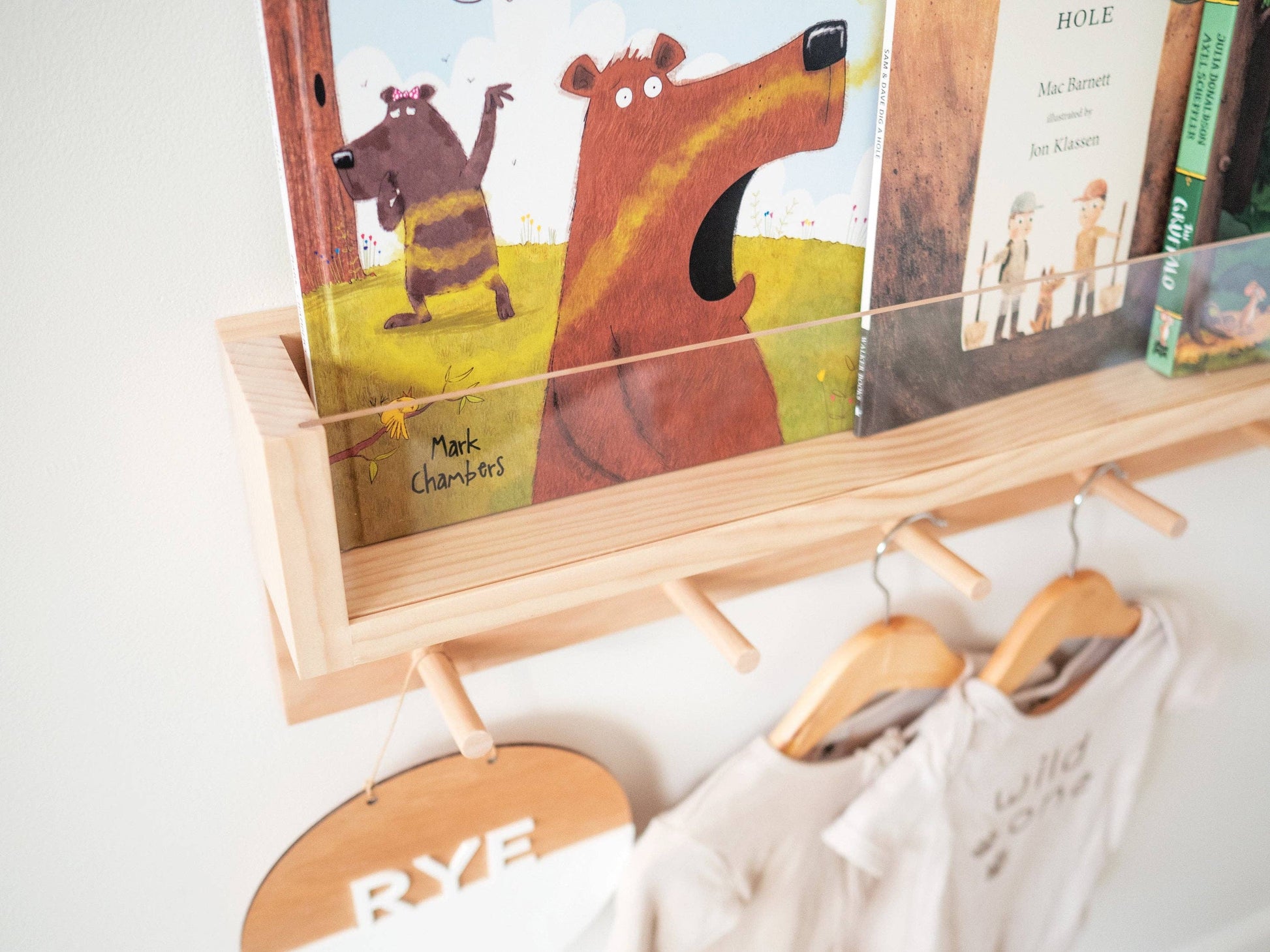 This nursery bookshelf with clothes hanger is the perfect addition to any nursery or child's room. This multi-functional bookshelf can feature either a clear or iridescent acrylic front, allowing you to choose the perfect style to suit your nursery décor. Designed with both functionality and style in mind, this nursery shelf is not just a book display shelf, but also includes a convenient clothes rack or hanger for added practicality. Keep your little one's favourite books neatly organized and within easy reach, while also having a handy place to hang their adorable outfits or accessories. This is also not only a practical storage solution, but also a beautiful piece of nursery décor.