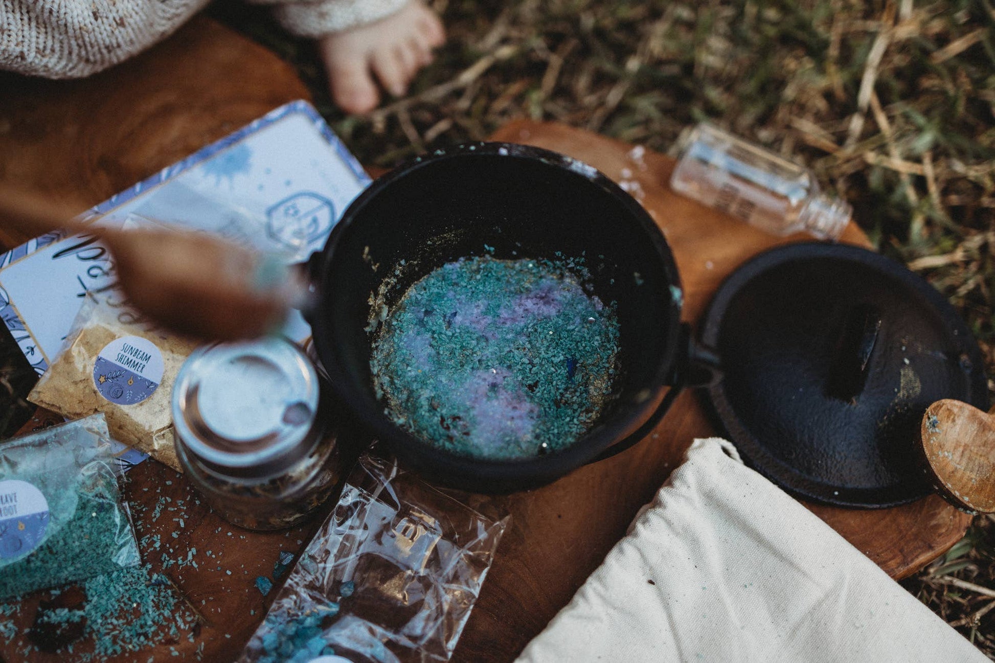 SHIELD PROTECT ME POTION POUCH - comes with 4 sparkly dry Ingredients in Biodegradable Cellophane bags 1 Potion Card - on one side is Shield Protect me spell. The other side is an I AM PROTECTED affirmation card to be recited as part of your child's daily affirmation ritual.