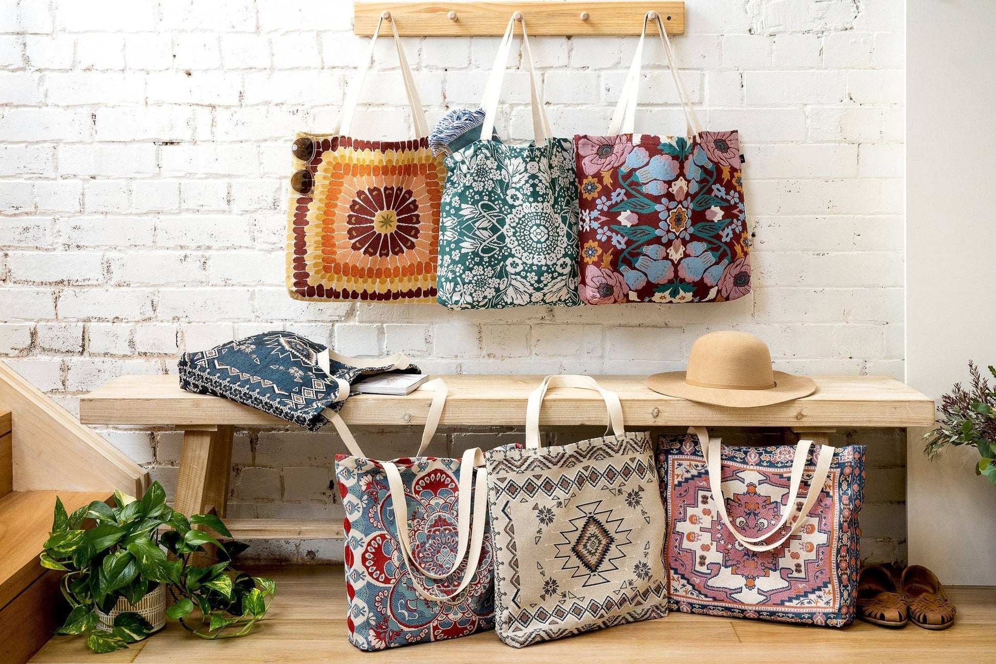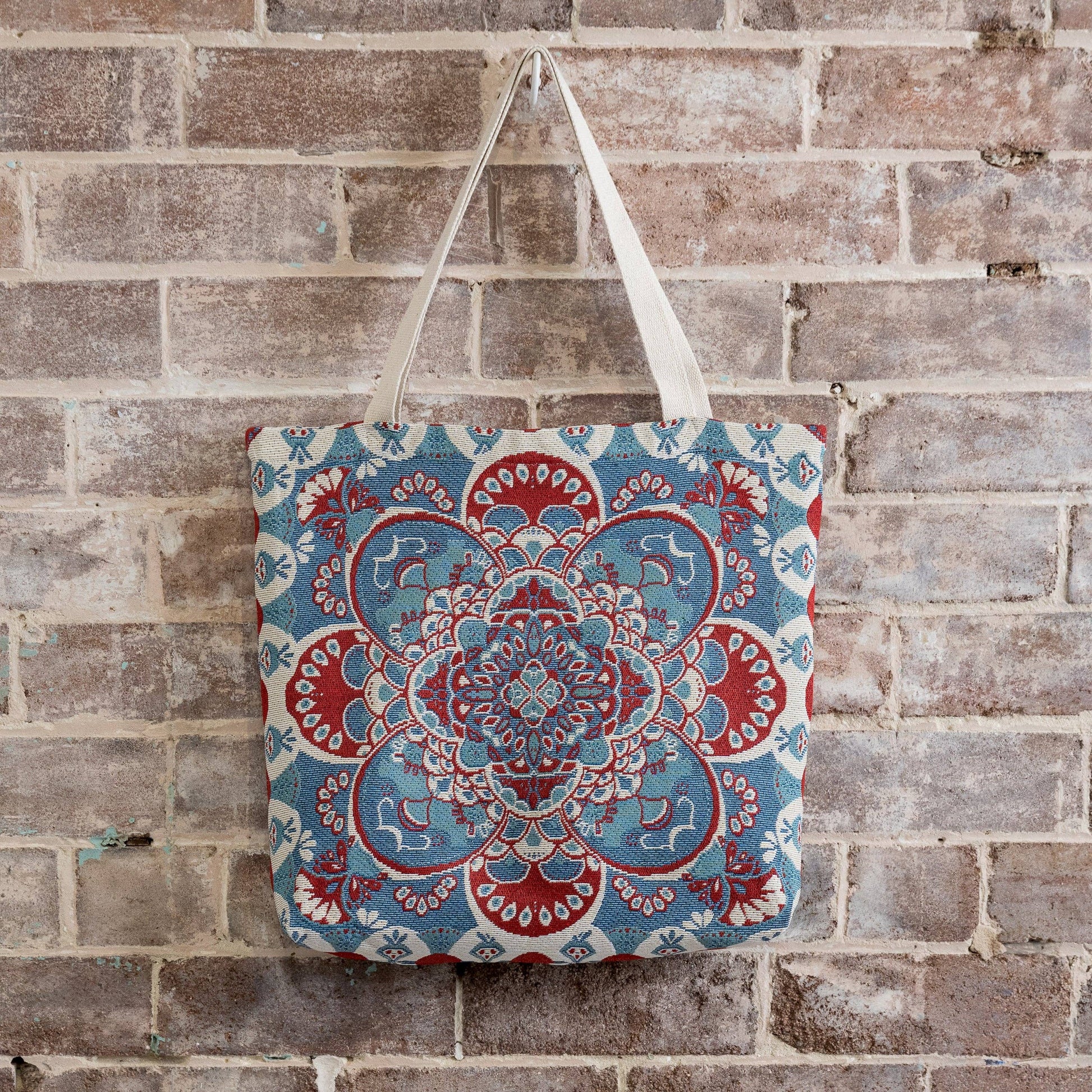 Our 'You'll Be Mine' Tote Bag is an ornate kaleidoscope oriental-inspired design. It has a contrasting colour combination of dusty blues (almost denim) and a deep urban red, with lighter beige accents. Hendeer’s gorgeous line of tote bags are woven with a sustainable blend of cotton and recycled polyester. Quality-stitched with handles made from cotton twill, these totes are made for the long run. Wear it to brunch with friends or to the beach with all your essentials.